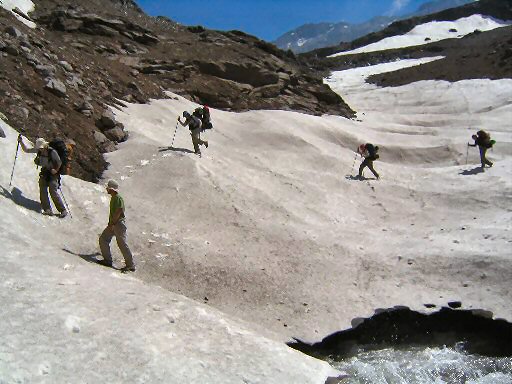 Descente vers la station de La Parva, attention au névé, ça glisse.